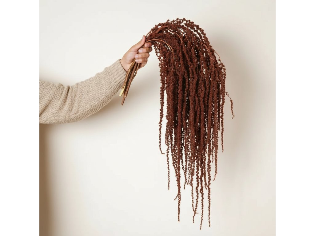 • Tip na kombinovanie: Spoj hnedý amaranthus s karamelovým ruscusom, čokoládovou glixiou a béžovou lagurusou – vznikne hrejivá, hlboká farebná paleta ideálna aj do luxusných aranžmánov.