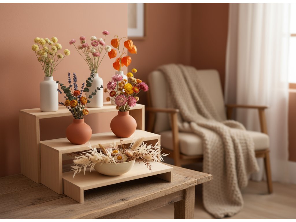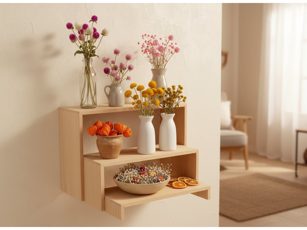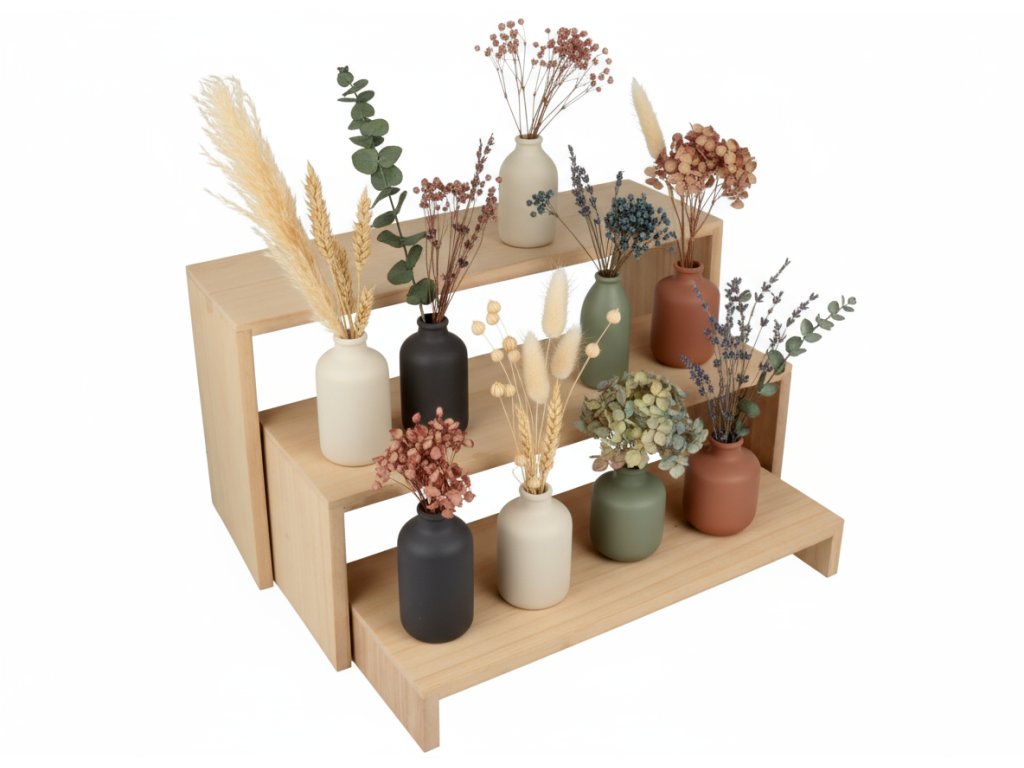 Dřevěné poličky z nelakovaného dřeva jsou mimořádně oblíbené u floristů a interiérových designérů – dají se libovolně upravovat, barvit a kombinovat s přírodními materiály. V kreativních dílnách se často používají jako základ pro minimalistické dekorace ze sušených květin nebo stabilizovaného mechu.