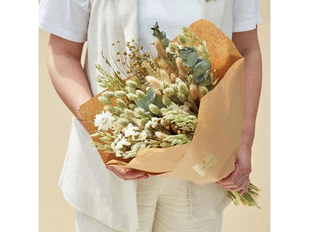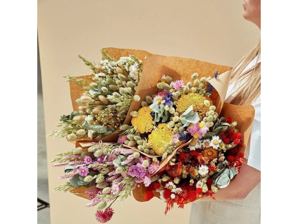 Sušené květiny nevyžadují vodu ani speciální péči. Uchovávejte je mimo přímé slunce, vlhko a průvan, aby si déle zachovaly svou krásu.