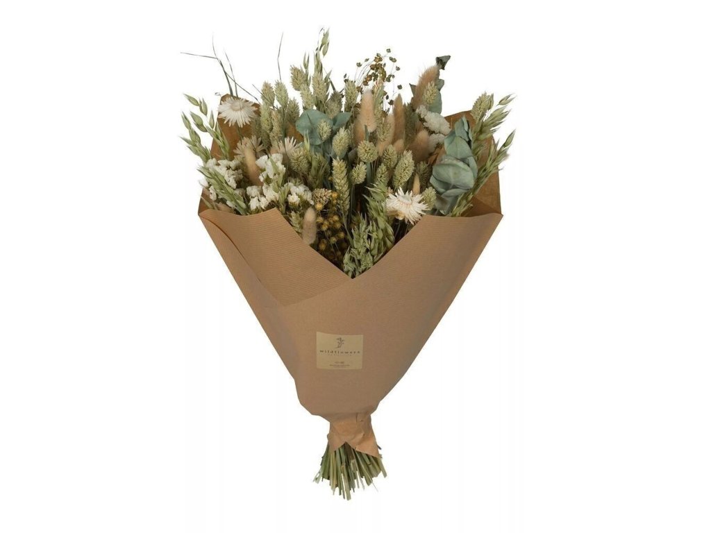 Kytice byla ručně vázaná na kontrolované farmě v Holandsku. Květy a trávy byly šetrně sušené, aby si zachovaly svou přirozenou strukturu a jemné barvy. Každý kus je originál, proto se mohou jednotlivé složky mírně lišit v závislosti na sezóně.