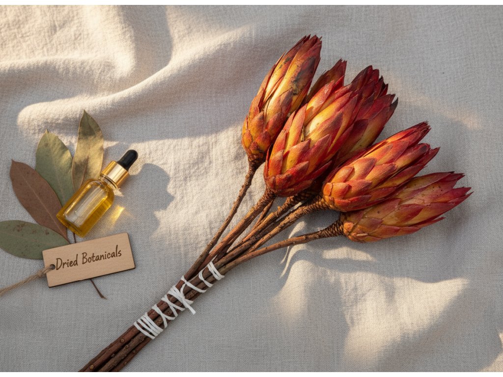 Kombinujte je s přírodními materiály, jako jsou lagurus, phalaris, sušené šišky nebo mech, pro vytvoření harmonických a trvanlivých aranžmá. Puky protey na stoncích se hodí nejen do klasických dekorací, ale i do minimalistických a moderních interiérů.