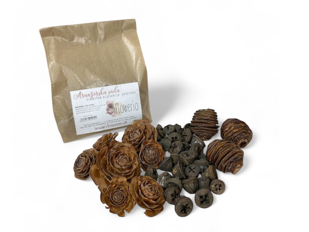 Plody eukalyptu (Eucalyptus sp.) a platyspernum (Platyspermum sp.) jsou pečlivě sušené, aby si zachovaly svůj tvar i přirozenou barvu. Cedrové růže pocházejí z šišek cedru (Cedrus deodara) a po usušení získávají charakteristický tvar růže s jemnou vůní dřeva. Každá sada je ručně komponovaná podle aktuální šarže.í.