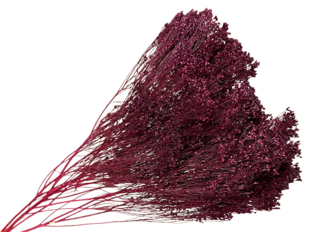 Janovec metlatý, latinsky Cytisus scoparius, pochází z oblastí západní Evropy, kde roste volně v přírodě. Rostlina se sbírá v období plného květu, aby si zachovala maximální hustotu a tvar. Po sběru se suší přirozeným způsobem ve stínu, aby se zachovala struktura a pevnost stonků. Následně se barví ekologickými pigmenty, které zvýrazňují sytost tmavé vínové barvy a prodlužují trvanlivost barvy. Díky šetrnému zpracování si květy udržují přirozený tvar a dlouhou životnost, což z nich dělá kvalitní a spolehlivý materiál pro aranžování.