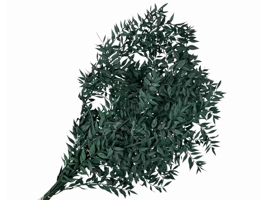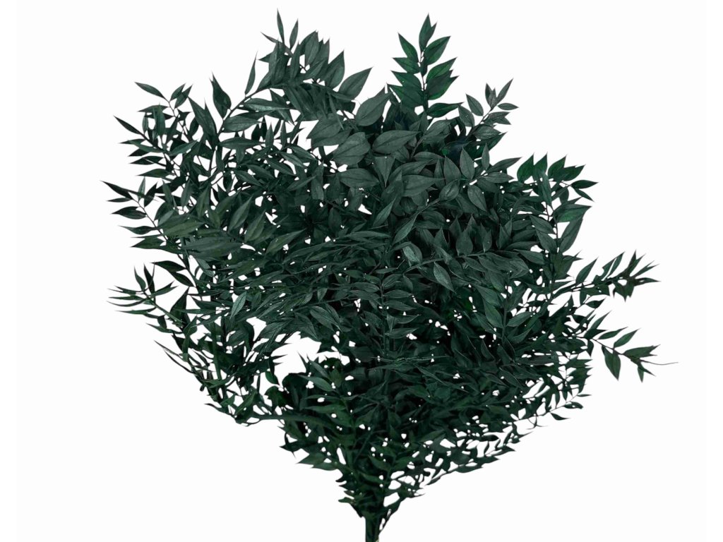 Ruscus (Ruscus aculeatus) pochází z Evropy a Středomoří. Listy jsou po sklizni šetrně stabilizovány glycerinovým roztokem s barvivem, který nahradí přírodní mízu. Díky tomu si zachovávají pružnost, sytou barvu a přirozený vzhled.