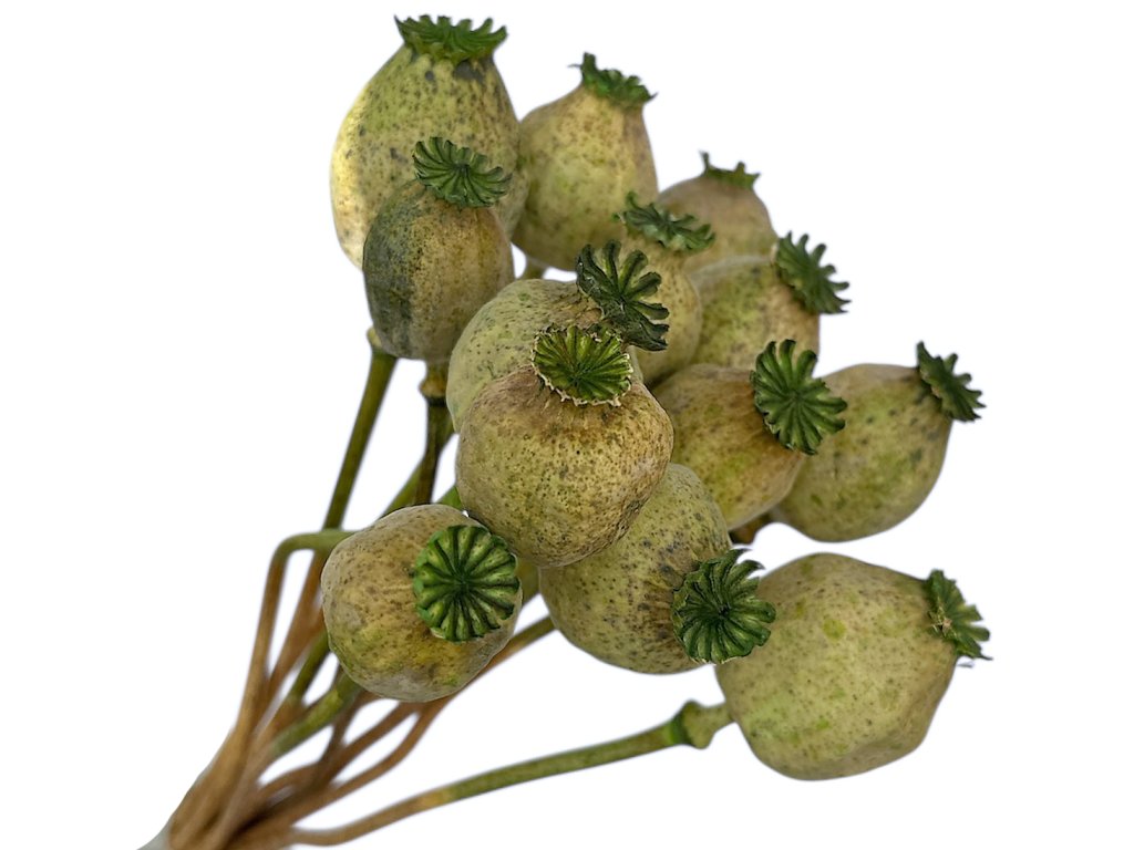 Makovice byly pěstovány a sbírány v Evropě. Po přirozeném usušení bez stabilizace prošly procesem barvení do jemné olivově zelené barvy, připomínající sušené bylinky či přírodní mech. Povrch má autentickou strukturu s jemnými pigmentovými skvrnami, které jen podtrhují jejich přírodní původ a výjimečnost.Péče a údržba