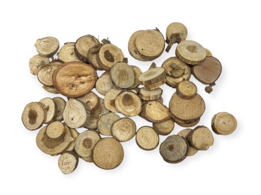 Okrúhle drevené plátky sú prírodným dekoratívnym materiálom vhodným pre aranžovanie, stolové dekorácie, DIY projekty, vence alebo minimalistické interiérové kompozície. Mix priemerov 3–6 cm a hrúbka 5–8 mm umožňuje jednoduché vrstvenie, lepenie alebo kombinovanie s inými prírodnými prvkami ako sušené plody, šišky či mach. Každý kus je originál s unikátnou kresbou ročných kruhov, ktorá dodáva aranžmánom autentický rustikálny vzhľad.