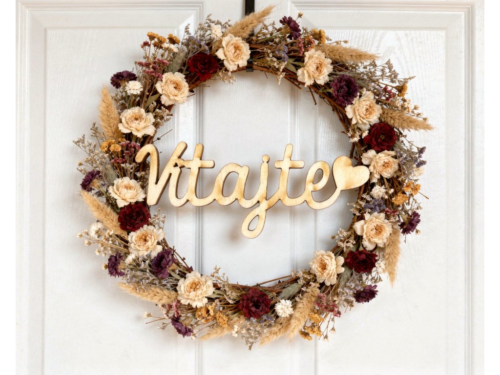 Výborne sa kombinuje so sušenými kvetmi, ako sú lagurus, phalaris, slamienky či limonky, ale aj s machom, prútenými základmi alebo minimalistickými prírodnými vencami. Nápis môžete umiestniť do spodnej časti venca, do jeho stredu alebo jemne zapracovať medzi kvety pre prirodzený efekt.