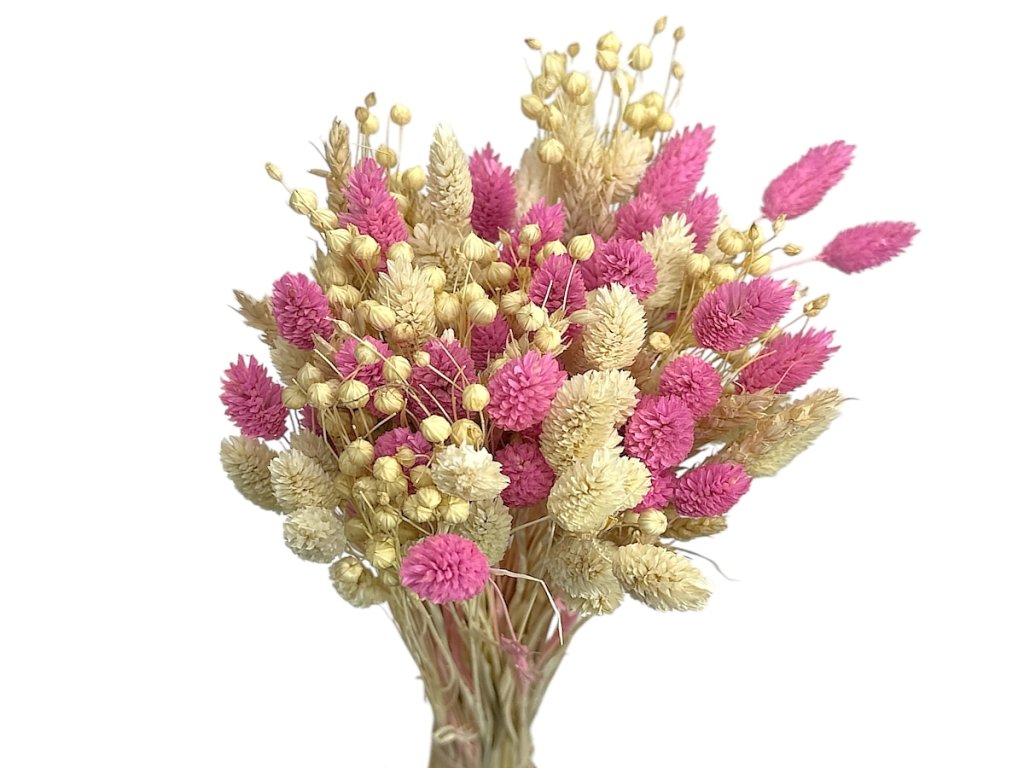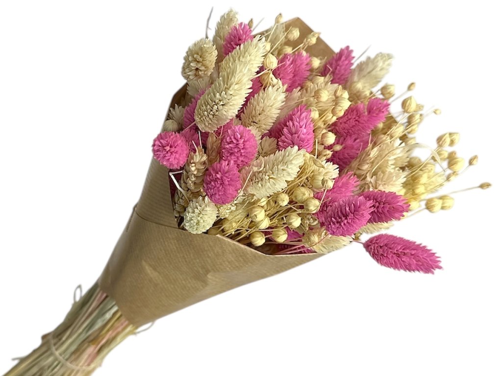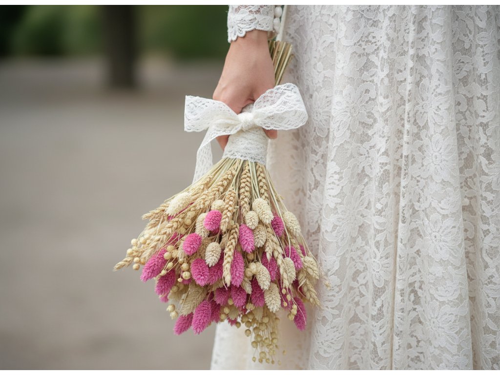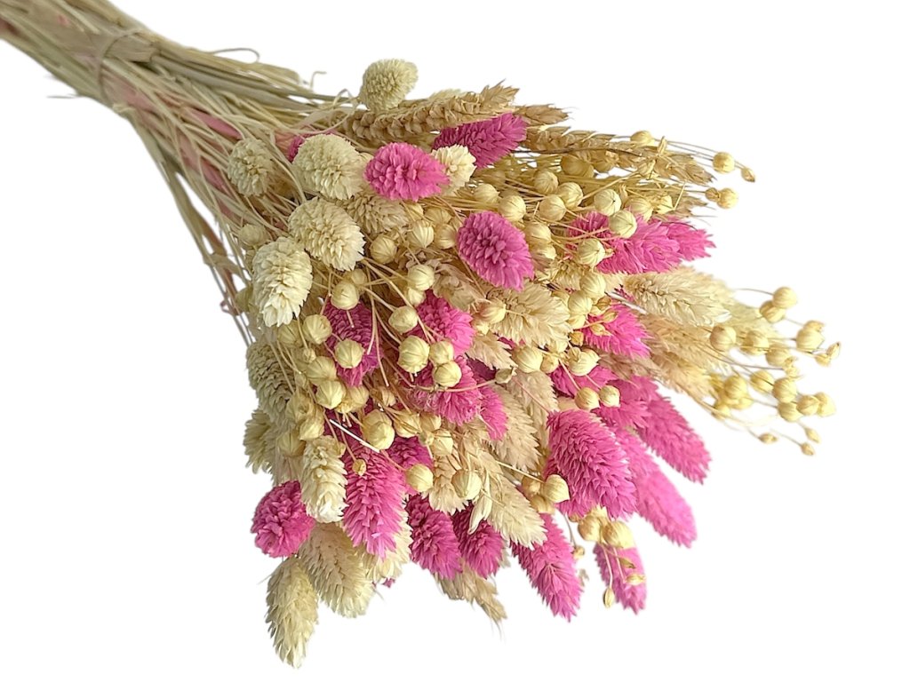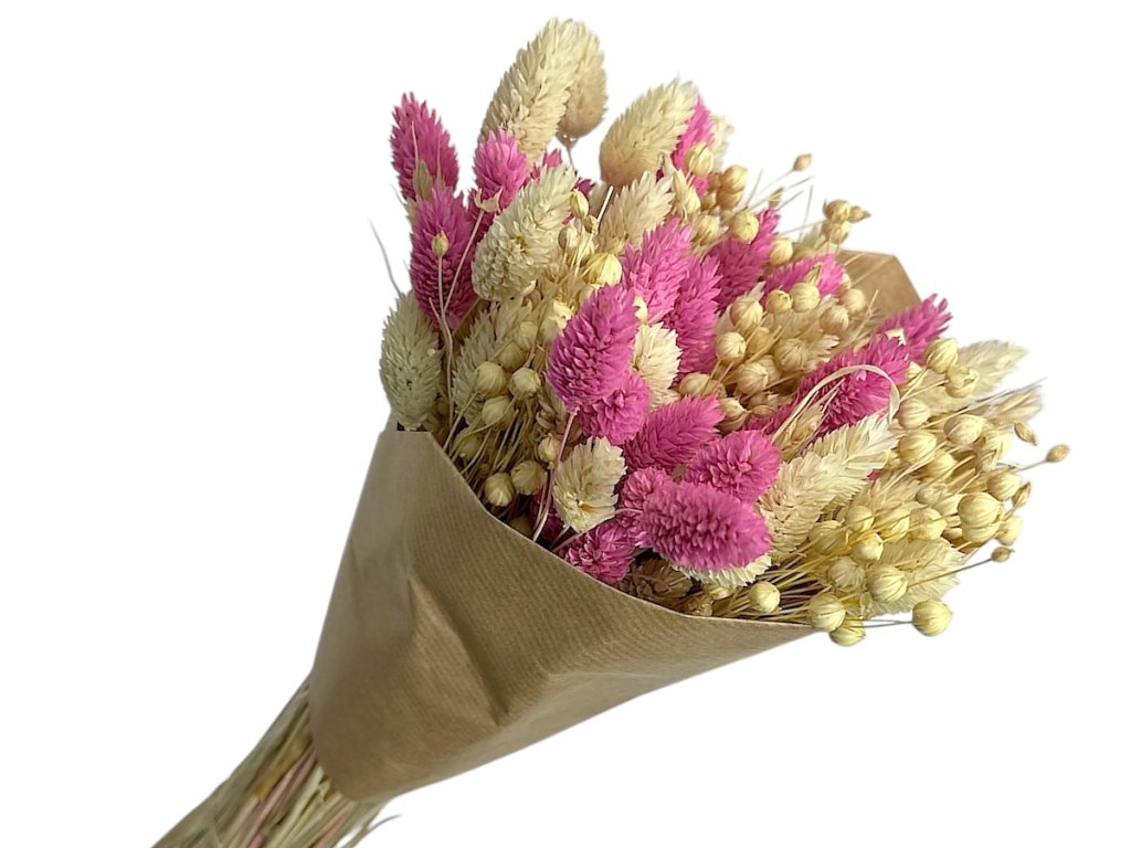 Kytica je starostlivo namiešaná z prírodne sušených rastlín pochádzajúcich z malých fariem a lokánych polí. Pšenica, ľan a phalaris sa ručne zberajú v optimálnom štádiu, následne sa sušia, bielia alebo farbia, aby sa dosiahla vyvážená kombinácia prírodných a červených odtieňov. Každá kytica je jedinečná — dĺžka stoniek a intenzita farby sa môžu líšiť, čo dodáva kompozícii autentickosť a charakter. Jednotlivé druhy sušiny sú zbierané v správnej fáze zrelosti a sušené prirodzeným spôsobom, aby si zachovali farbu, tvar a pevnosť. Kytica je ručne viazaná s dôrazom na harmonickú farebnú kombináciu a vyvážený objem.