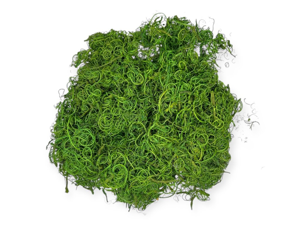 Sušený kučeravý mach Curly moss v svetlo zelenej farbe je obľúbený materiál vo floristike pre svoj objem, pružnú štruktúru a prirodzený efekt. Vynikajúco sa hodí na vyplnenie aranžmánov, dekorovanie vencov, mís, boxov a sezónnych kompozícií.