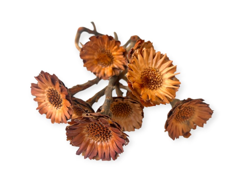 Protea Compacta pochádza z oblasti Cape Floristic Region v Južnej Afrike, ktorá je známa ako botanický raj. Názov „protea“ je odvodený od gréckej mytologickej postavy Protea, ktorý menil podobu – rovnako ako tento rod kvetov ponúka nespočetné variácie tvarov a farieb. Odstránené lupene odhaľujú fascinujúcu vnútornú štruktúru, vďaka čomu kvet pripomína drevitú margarétu – prírodný šperk s exotickým pôvodom.