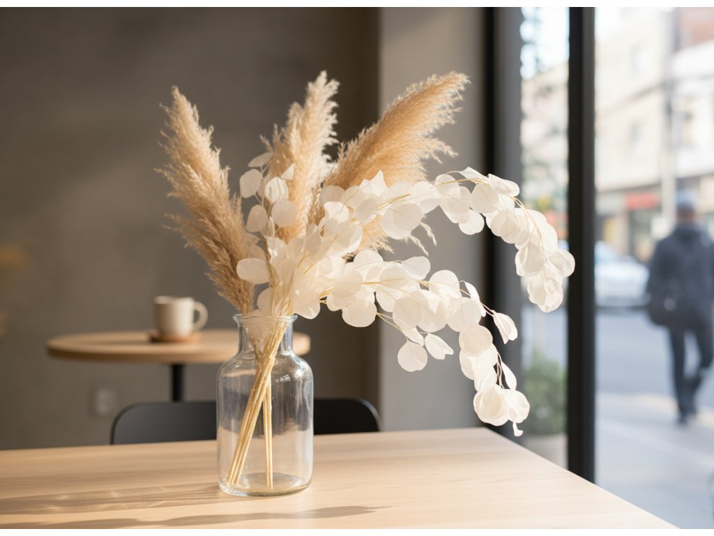 • Unikátny tip: Pre svadobný luxus skús kombináciu bieleného Populusu s krémovým ruscusom, bleached setariou a jemnou bielou glixiou – vznikne veľmi čistá, moderná a vzdušná kompozícia vhodná aj pre fotografické stylingy