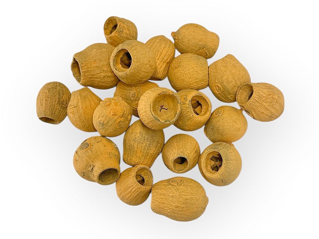 Plody pochádzajú z eukalyptu Eucalyptus leucoxylon, známeho ako Bell Gum. Po zbere sú sušené a následne povrchovo upravené namáčaním vo vodnej báze s pigmentmi. Tento spôsob farbenia je podobný vodnej maliarskej farbe (napr. interiérovým farbám na stenu) – vytvára matný, jemný povrch, ktorý zachováva prirodzenú štruktúru plodov. Každý kus je originál a môže sa mierne líšiť tvarom aj odtieňom.