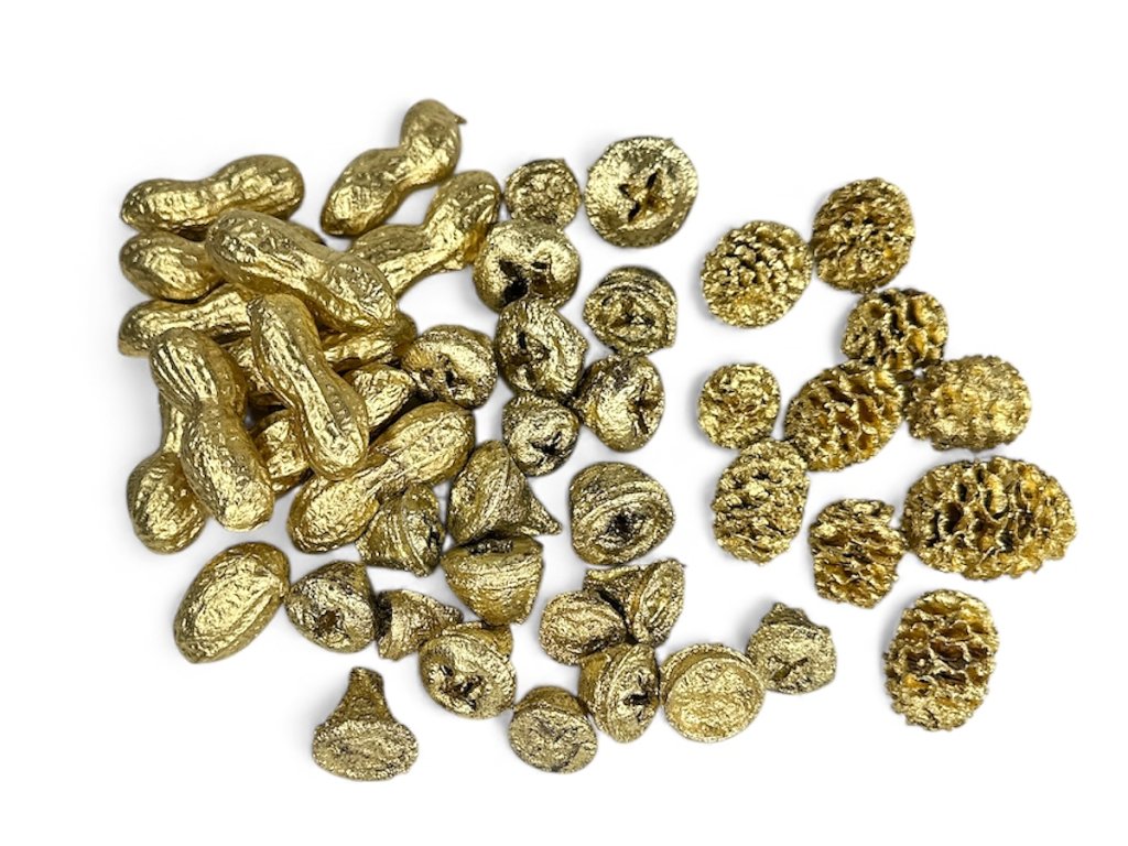 Sada je poskladaná z prírodných materiálov – cyprusových šišiek, sušených plodov a ratanových prútených guličiek. Každý prvok je po vysušení ošetrený metalickým zlatým nástrekom, ktorý zvýrazňuje jeho štruktúru a dodáva jednotný, luxusný lesk. Povrchová úprava je stabilná, vhodná na interiérové dekorácie a odolná voči drobnému mechanickému poškodeniu.