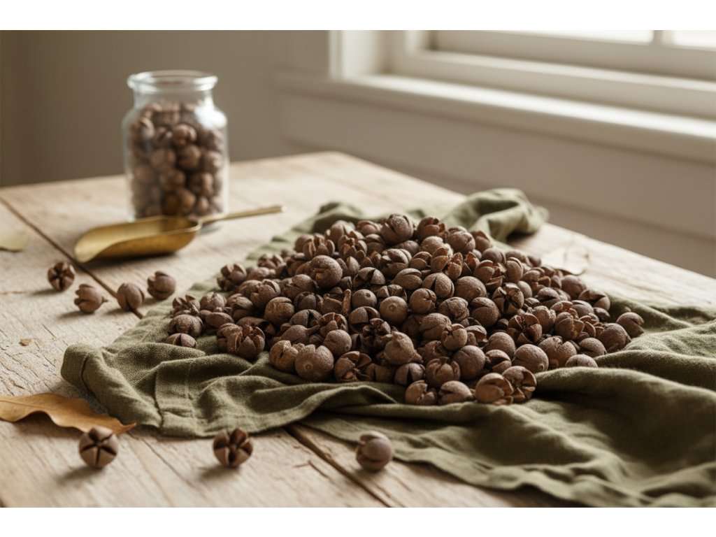 Plody uchovávajte v suchu a mimo priameho slnečného svetla, aby si zachovali svoju prirodzenú farbu a tvar. Neodporúča sa ich umývať vodou – na odstránenie prachu stačí jemný štetec alebo suchá handrička. Vyhnite sa vlhkému prostrediu, ktoré by mohlo ovplyvniť ich povrch a trvácnosť.