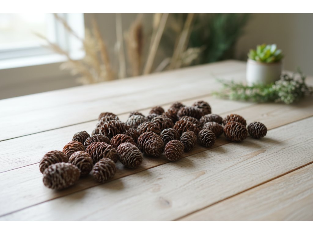 Šišky sú pevné a ľahko sa s nimi manipuluje. Najlepšie sa aplikujú pomocou lepiacej pištole alebo jemným zatlačením do aranžérskej hmoty. Môžete ich kombinovať s inými prírodnými materiálmi a vytvoriť harmonickú, vrstvenú kompozíciu. Pre jemnejší vzhľad pridajte biele alebo svetlé doplnky, pre teplý kontrast tmavšie sušené plody či trávu.