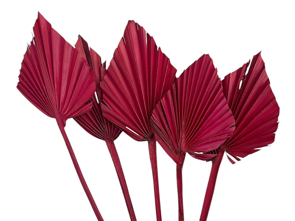 Palmové listy pochádzajú z čeľade Arecaceae. Po zbere sú prirodzene vysušené tak, aby zostali tvrdé, stabilné a nestrácali typickú rebrovitú textúru. Následne sú ručne tvarované do oštepového profilu, ktorý floristi oceňujú pre jeho čistú líniu a jednoduché vkladanie do aranžmánov. Farba sa aplikuje rovnomerne a šetrne, aby zostala intenzívna a zároveň zachovala pevnosť vlákien.