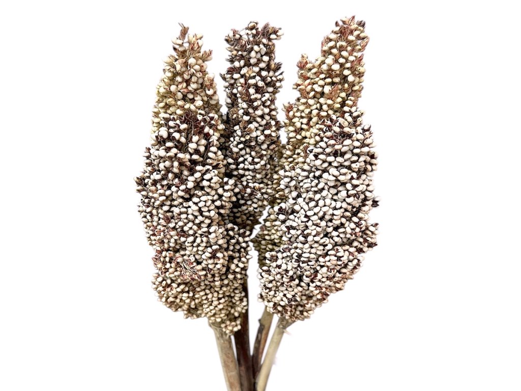 Cirok (Sorghum bicolor) je tradičná poľnohospodárska rastlina pestovaná pre svoje tvrdé, pevné klasy. Po zbere sa suší prirodzeným spôsobom pri nízkych teplotách, aby si zachoval tvar a štruktúru. Biela farba je dosiahnutá šetrným farbením, ktoré je stabilné a vhodné na dlhodobé dekorácie.