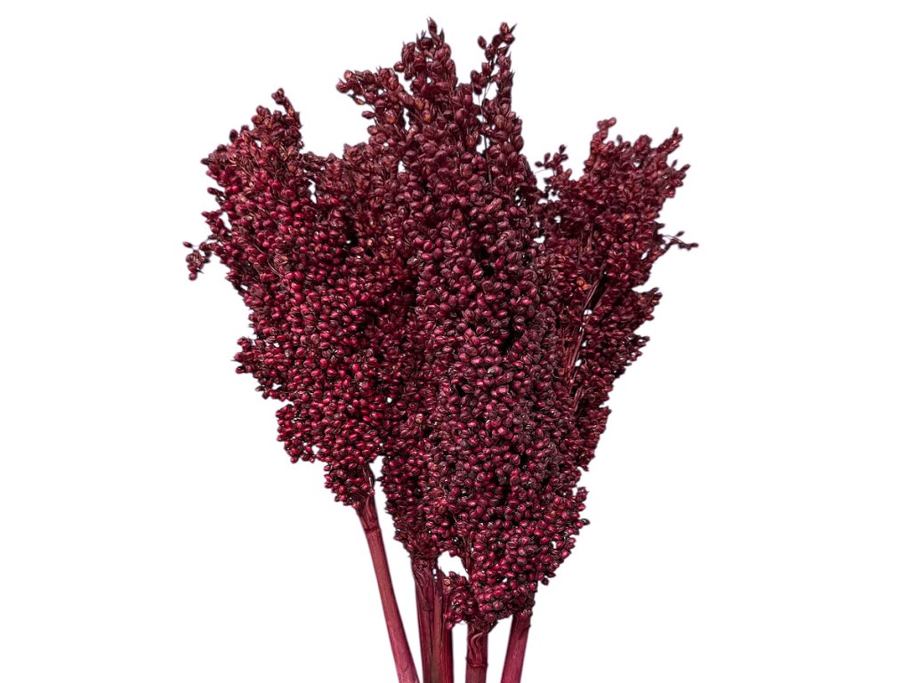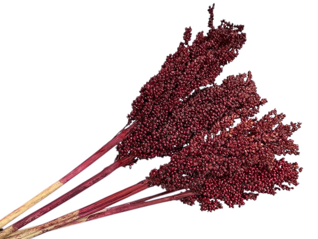 Cirok (Sorghum bicolor) sa pestuje pre svoje pevné, husté klasy. Po zbere sa suší prirodzeným spôsobom pri nízkych teplotách, aby si zachoval tvar a objem. Bordová farba je dosiahnutá stabilným dekoratívnym farbením a je vhodné na dlhodobé interiérové použitie.