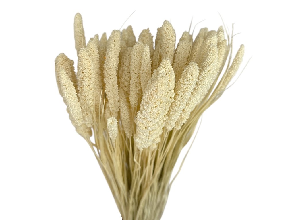 Bielenie prebieha šetrným spôsobom, aby si setaria zachovala jemnosť aj tvar bez poškodenia. Výsledný odtieň je čistý, svetlý a stabilný, vhodný pre profesionálne floristické použitie aj pre interiérový dizajn.