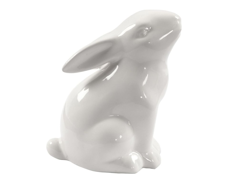 Minimalistický keramický biely zajac - ušatý V bielej farbe s výškou cca 11,5 cm má jemný tvar vajíčka so zajačou papuľkou a nosom, bez očí, doplnený o dlhé vzpriamené uši....