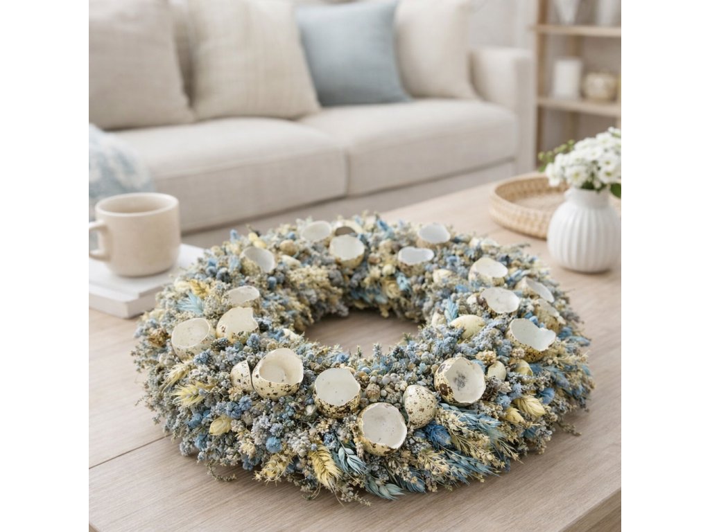 VSkombinujte otvorené prepeličie škrupiny so stabilizovaným machom, jemným lagurusom, bielymi slamienkami a pierkami pre čistý jarný aranžmán v prírodnom alebo boho štýle..